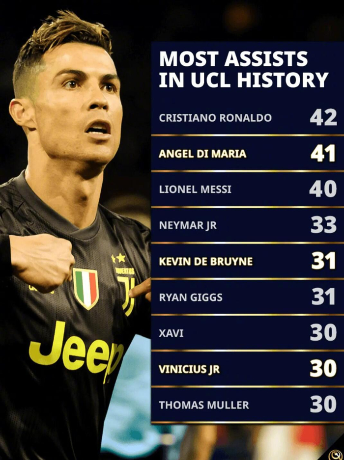 按UEFA官网 的“历史助攻榜”统计,维尼修斯以30助追平哈维,排名并列历史第7。目前前10如下:
