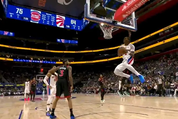 第三节比赛中,奥萨尔飞身大拉杆上反篮打进,活塞下半场领先猛龙13分。
