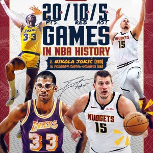 昨天输球的比赛,约基奇超越了贾巴尔,成为NBA历史20+10+5场次数最多球员#nba#...